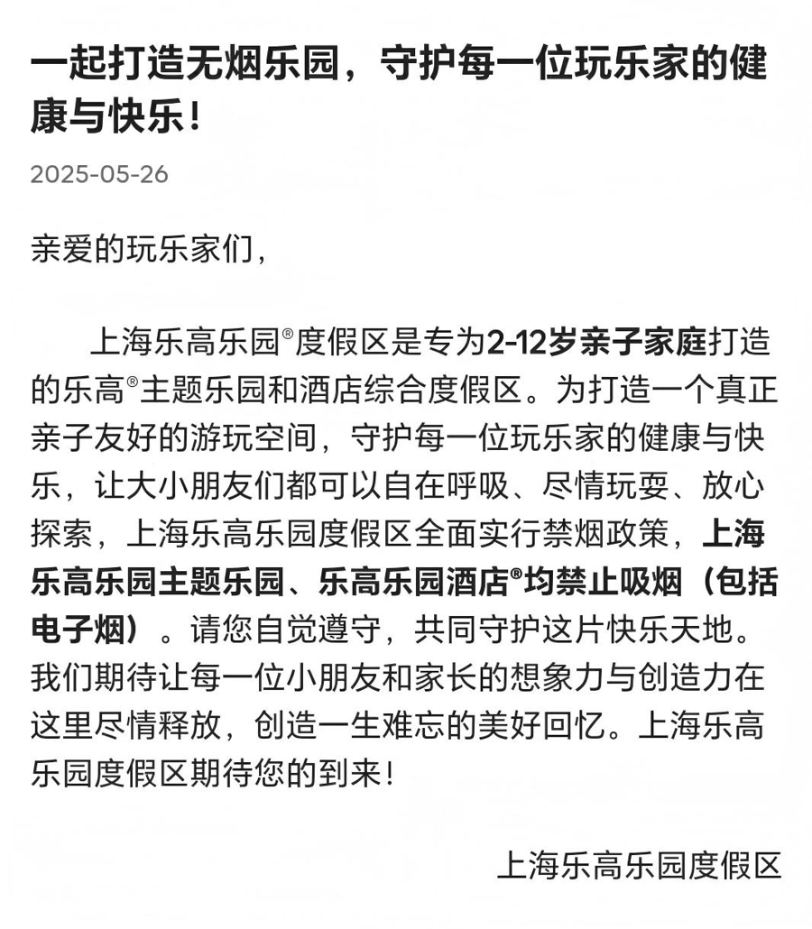 今年5月,上海乐高乐园与上海迪士尼、欢乐谷、海昌海洋公园等沪上知名主题乐园联合发起“无烟乐园、文明游园、共建共享”的倡议,共同推动主题乐园行业的无烟环境和文化建设。